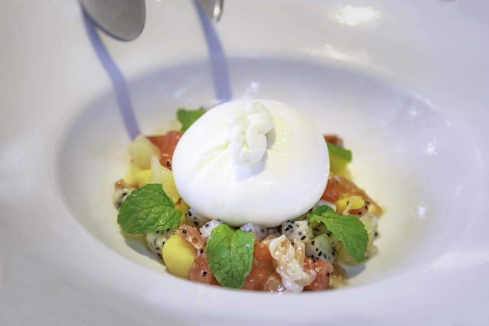 2. Seasonal Fruits/Persimmon and Burrata Salad with Crunchy Sesame Topping