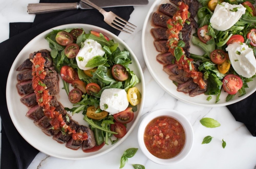 A twist on the regular Caprese salad, this involves a blend of beefsteak tomatoes or greenhouse tomatoes topped with burrata and an olive streusel condiment topping that you’re sure to be obsessed with.