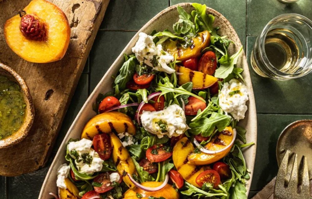 7. Fried Farro, Tomato, Peach, and Burrata Salad