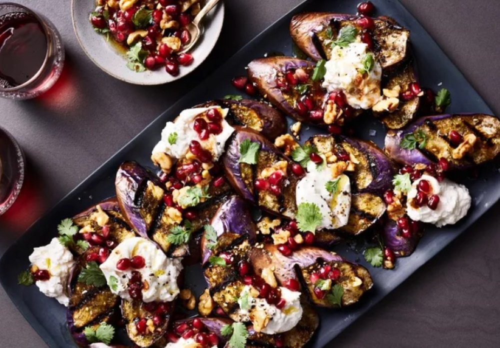 Filled with Middle Eastern flavors, burrata brightens up this addictive cheese and vegetable dish. The juiciness of the eggplant pairs perfectly with the dollops of burrata, and a sweet, nutty relish really pulls things together.