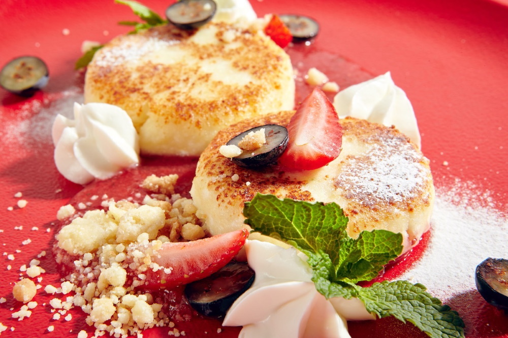 Syrnyky are cottage cheese pancakes. They’re a very popular breakfast dish but can also be eaten as a dessert. They are served with sour cream and jam or chocolate drizzle. They make quite a delicious and nutritious meal, and are very protein rich thanks to the cottage cheese.