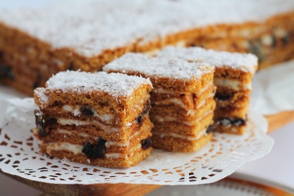 This is a popular dessert that is similar to a cheesecake that originated in the west of Ukraine but is nowadays popular everywhere in the country. It’s made by finely blending cottage cheese and mixing it with sugar, lemon zest, and eggs. The batter has to be smooth, without any lumps, then raisins are mixed into the batter. You bake it in the oven for 40 to 50 minutes and then it has to cool for a few hours before you pour chocolate glaze on top. The resulting dessert is absolutely scrumptious.