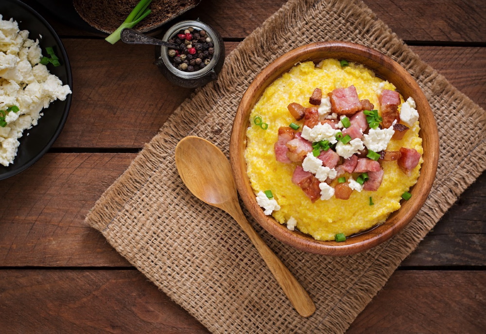 Banosh is another regional dish that’s very popular in the Carpathian mountains. While it’s also made with cornflour it’s quite different in texture to Kulesha. It’s typically richer in taste since it’s cooked using cream or sour cream and butter, it’s also served with brynza cheese, bacon, mushrooms or fried pieces of salo called shkvarky.