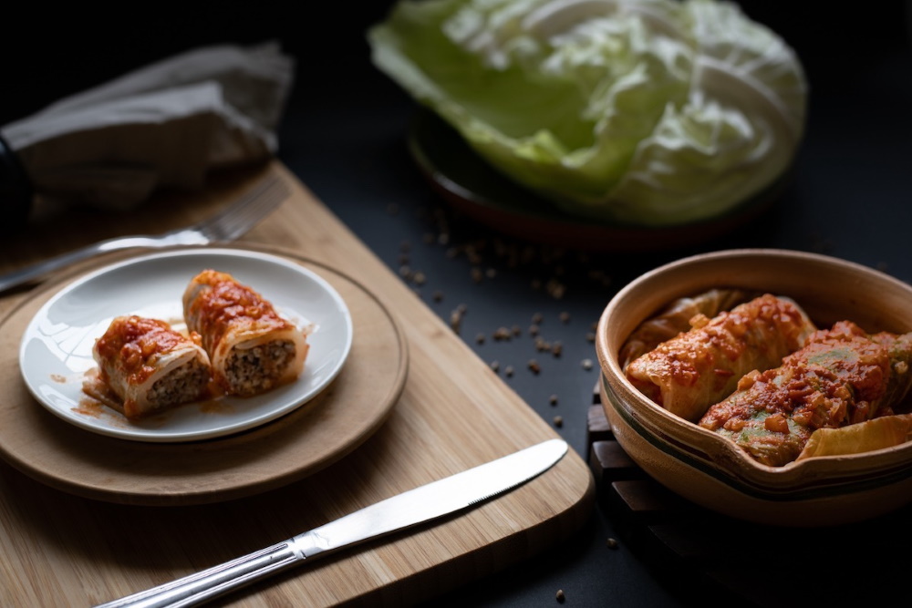 Holubtsi are a popular Ukrainian main dish. They’re cabbage rolls that are filled with a mixture of rice, carrots, onions, mushrooms, and meat. They can also be made vegetarian by simply omitting the meat in the recipe. They’re usually slow-cooked in a big pan, all stacked tightly together and drizzled with a tomato sour cream sauce.