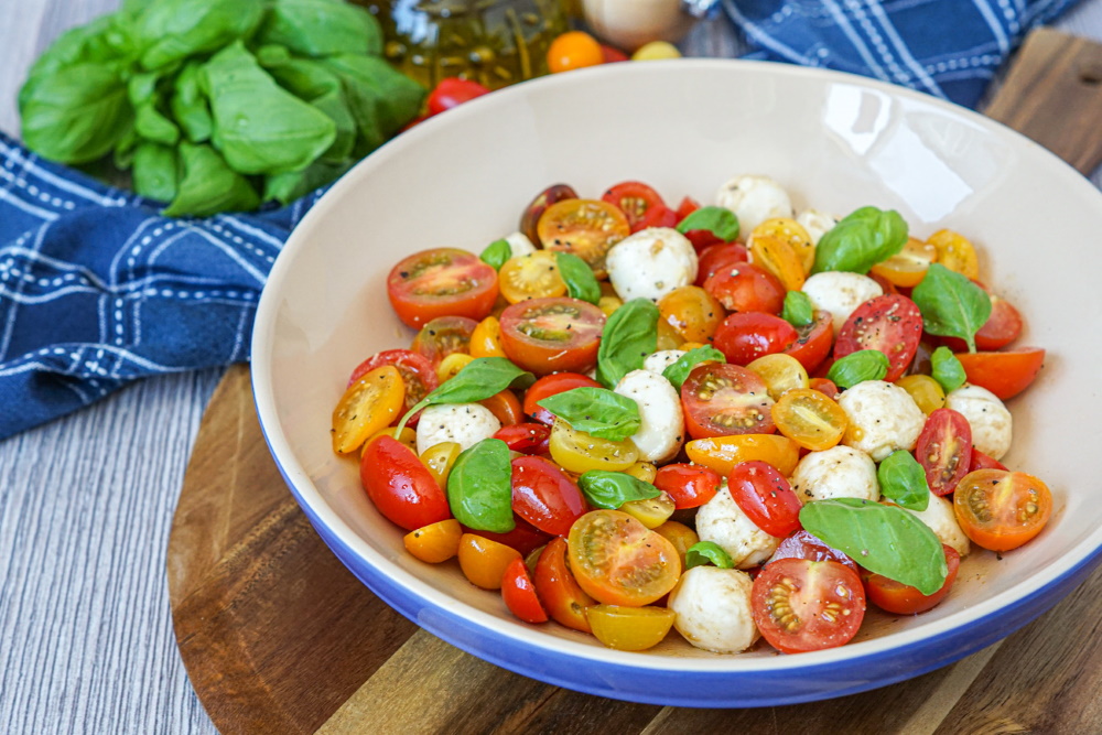 Tan fácil como cortar por la mitad tomates cherry y mezclarlos en un bol con bolitas queso mozzarella fresco (tipo bocconcini). Aderezar con aceite de oliva extra virgen, vinagre balsámico, sal y pimienta al gusto y unas hojas de albahaca fresca. También puedes hacerla con tomates grandes en rodaja, pero con los cherry el plato queda más bonito.