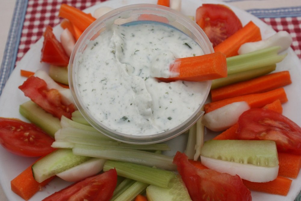 Mezcla el yogur con pepino rallado, ajo, jugo de limón y aceite. Acompaña con bastones de verduras.