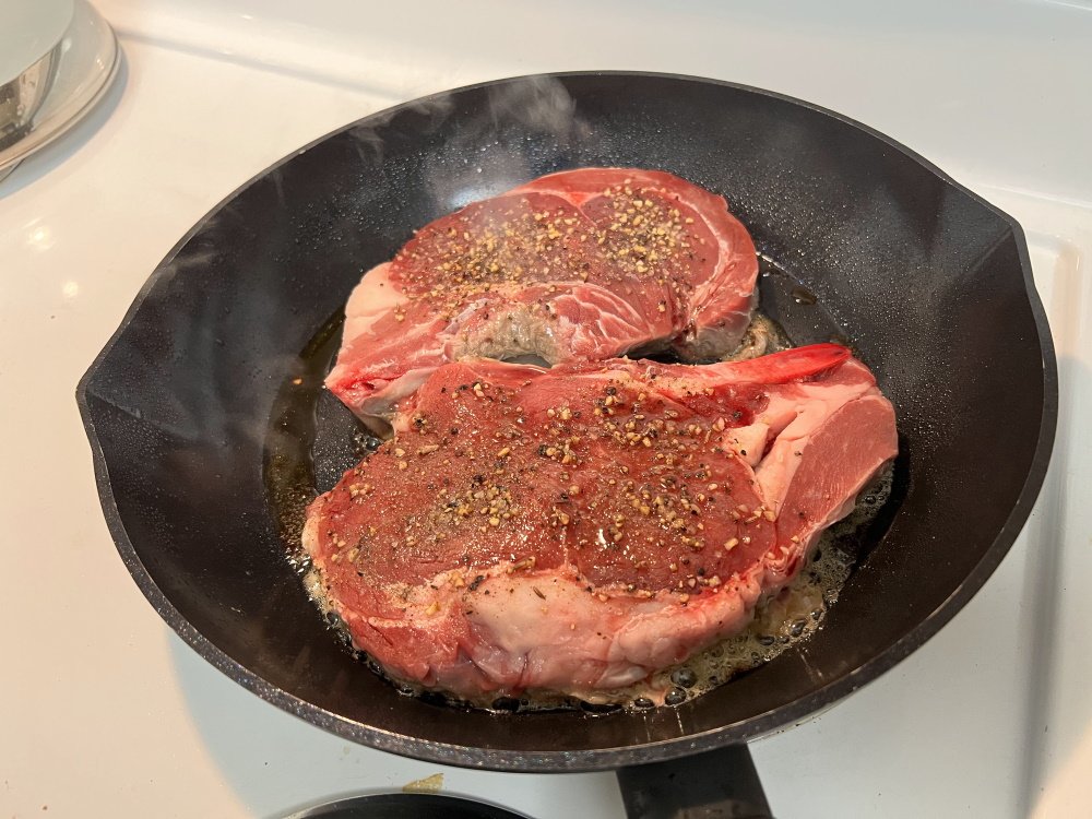 – Coloca el ribeye en la sartén caliente. Escucharás un siseo cuando entre en contacto con la sartén, lo que indica una buena temperatura.