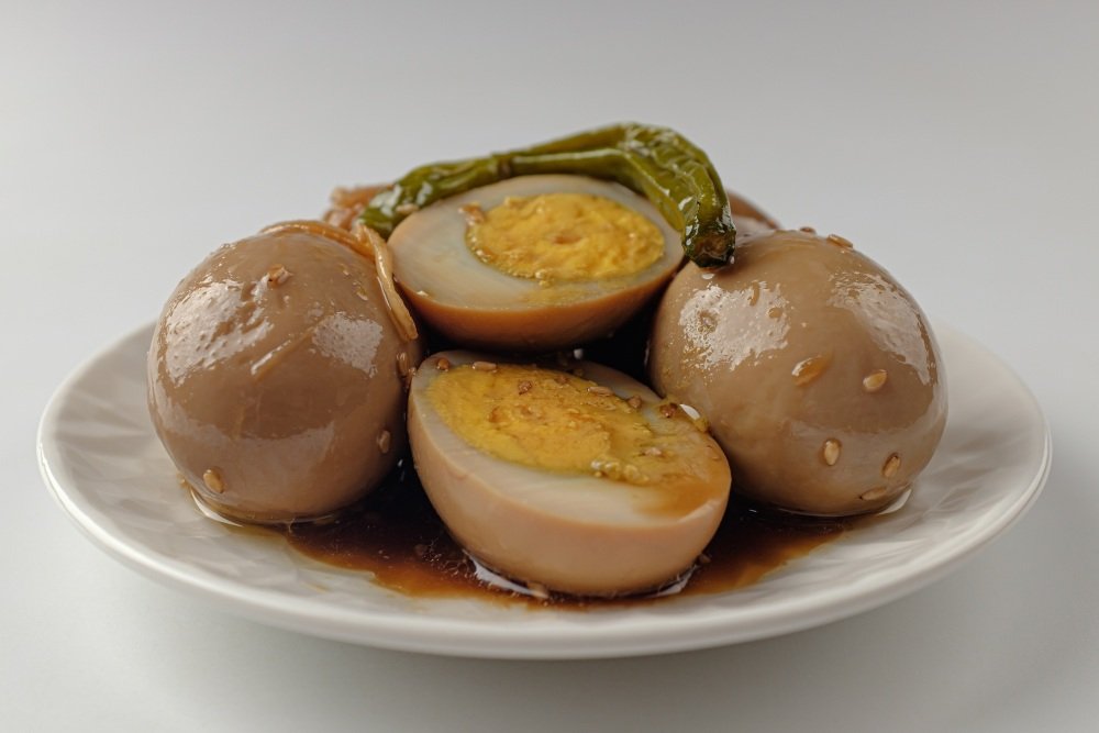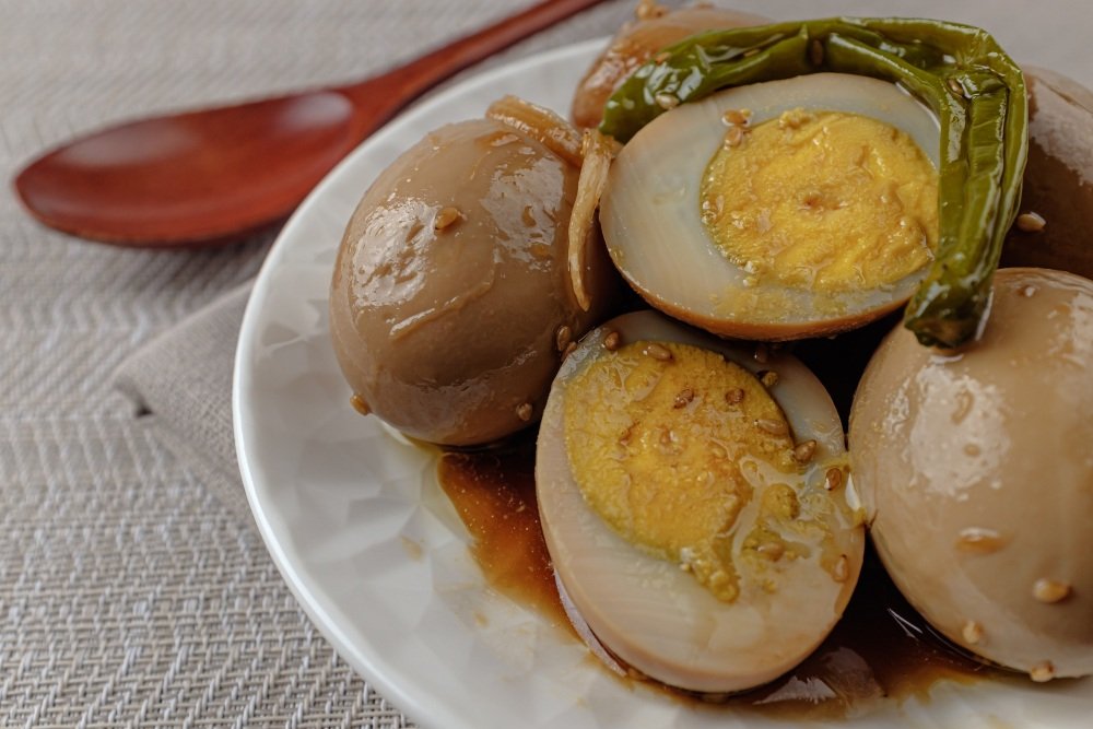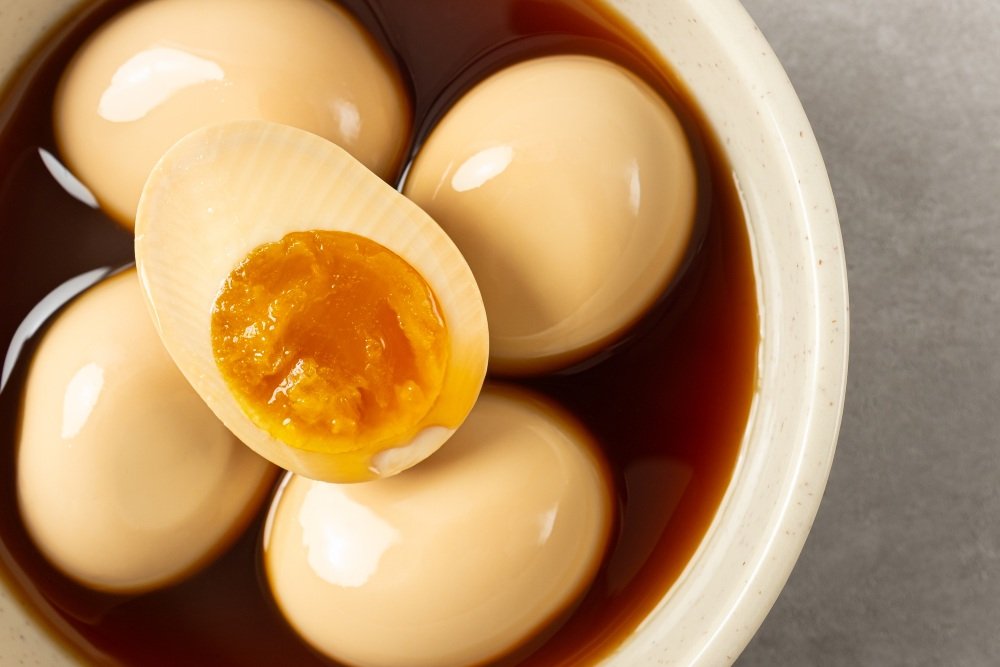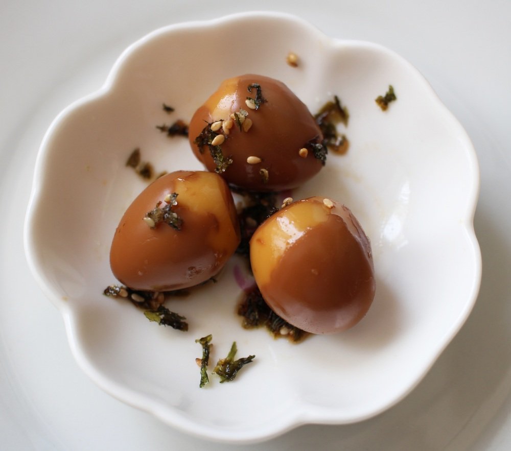 Se trata de huevos cocidos y marinados durante varias horas (o toda la noche, si puedes resistirte), sumergidos en una mezcla mágica de: