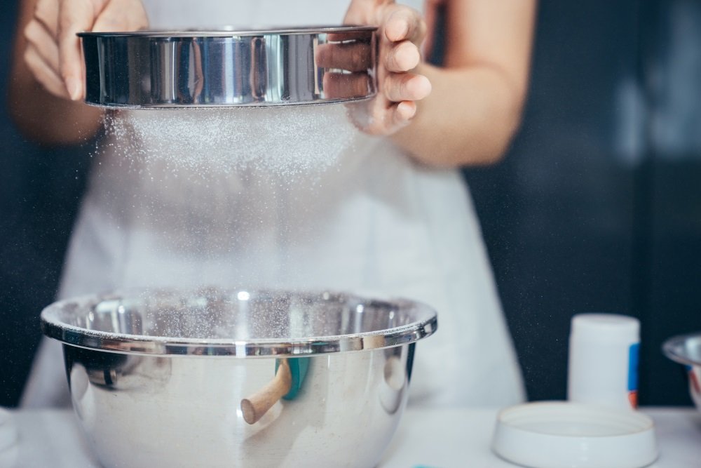 1. En un bol grande, tamiza la harina y la levadura en polvo. Agrega la pizca de sal y mezcla bien.