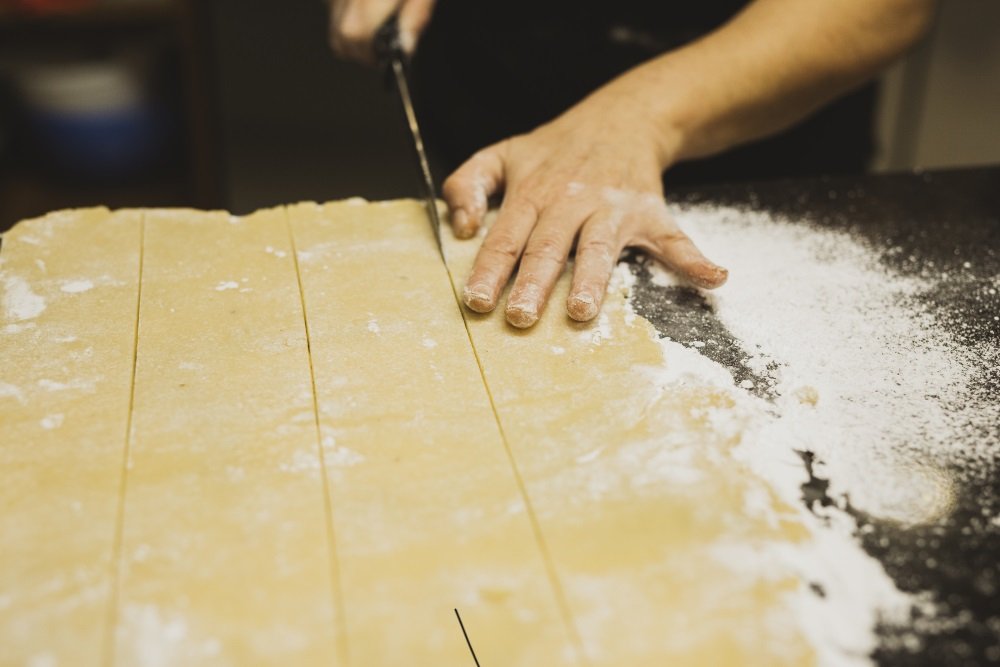 6. Pasado el tiempo de reposo, divide la masa en porciones pequeñas y estira cada porción con un rodillo hasta obtener una lámina fina, de aproximadamente 2-3 mm de grosor.