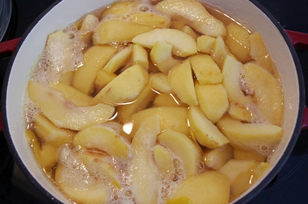 – Coloca los trozos de membrillo en una olla grande y cubre con agua.