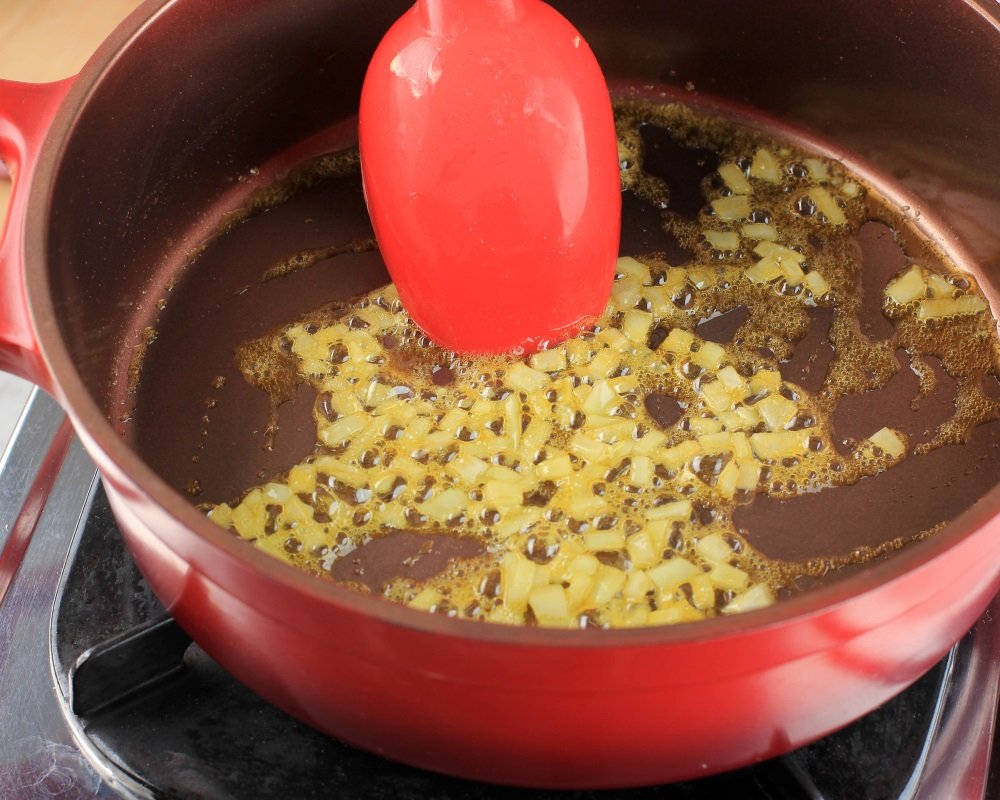 3. En una olla grande, calienta un par de cucharadas de aceite de oliva a fuego medio. Agrega la cebolla y los ajos picados y sofríe hasta que estén dorados y fragantes.