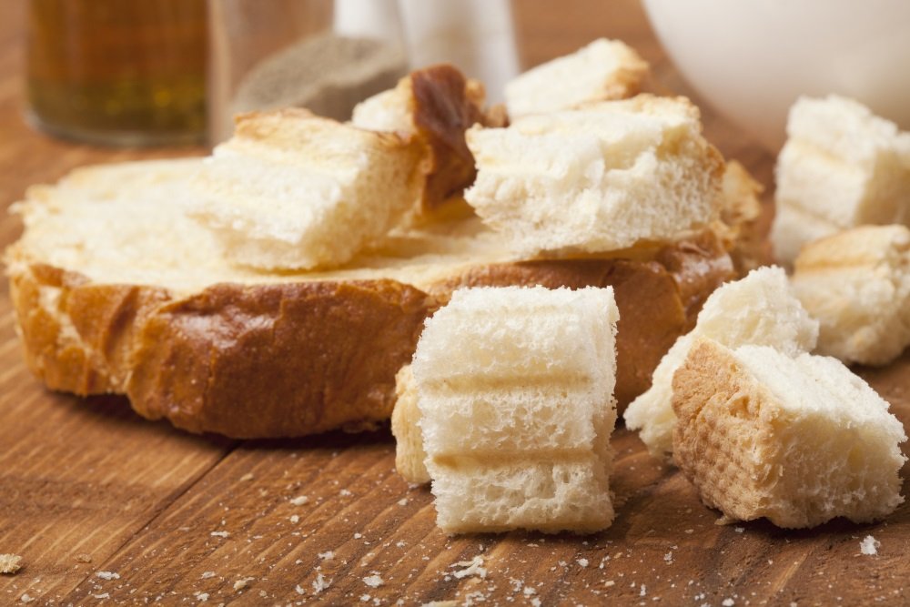 1. Corta el pan duro en rodajas finas y luego en trozos más pequeños. Puedes dejar la corteza si lo prefieres.