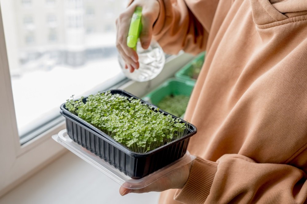 – Consider shallow trays for microgreens or small pots for herbs.