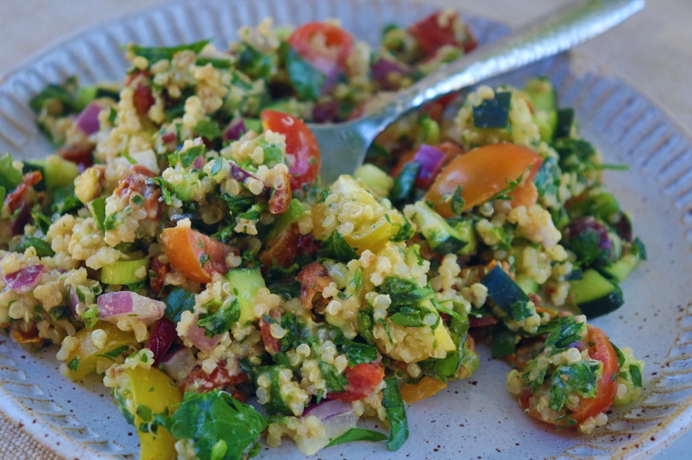 Packed with all kinds of healthy fats, veggies, protein and carbs, this salad is universally appealing for all kinds of eaters, which is shocking when you consider that there’s no dressing on it. It’s something about the blend of herbs and fresh flavors that fuse together. The salad s Mediterranean themed and contains bulgar, cucumbers, parsley, red onion, garbanzo beats, feta and mint for an absolutely irresistible dish. With all the components, it’s pretty similar to a classic tabouleh salad, making it a versatile dish for any occasion.