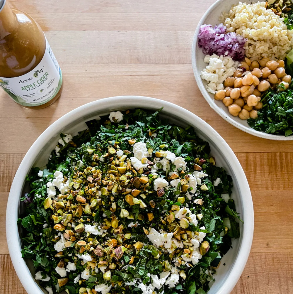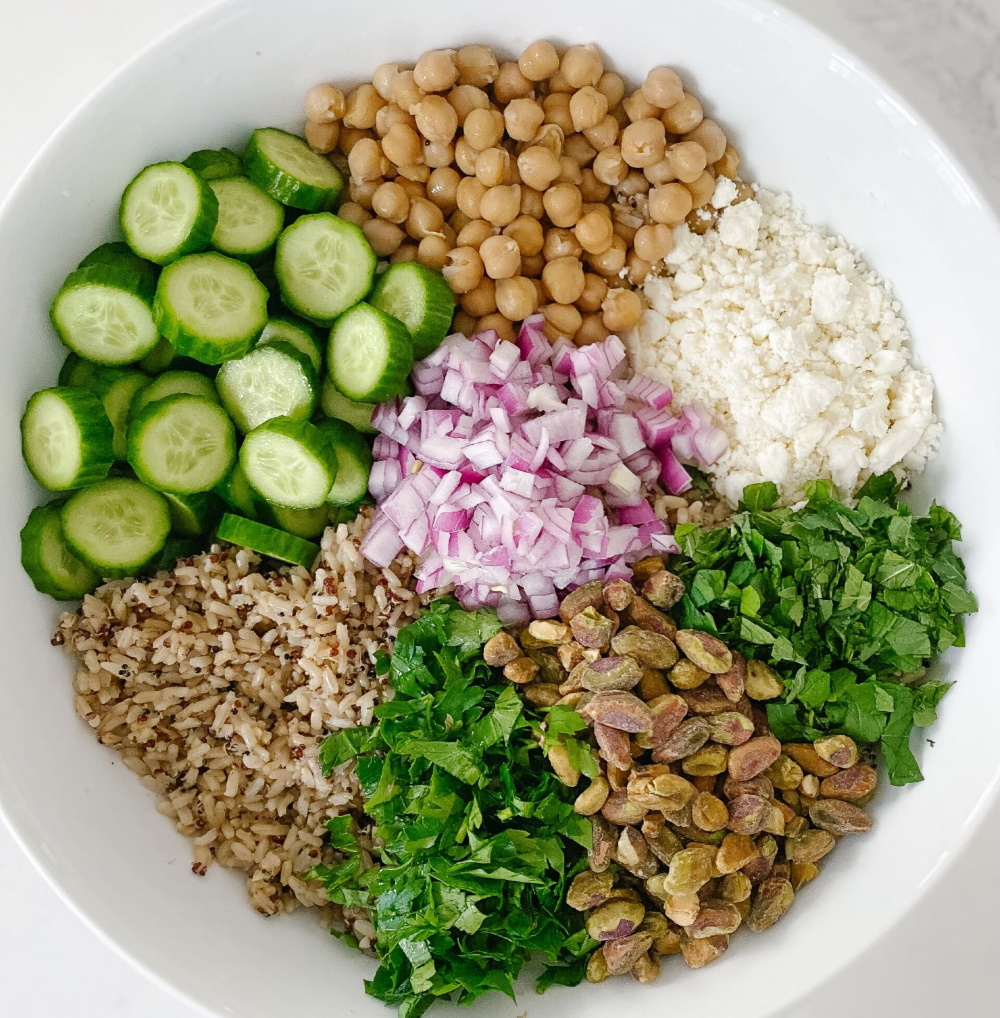 First, bring two cups of water or vegetable stock to a boil, adding a cup of bulgar. Then, cover it and let it simmer for 20 minutes. While it simmers (stir occasionally), prep a large bowl filled with your 1/4 cup to a 1/2 cup of mint, shelled pistachios, cucumbers, chickpeas, red onion, feta, bulgar and parsley.