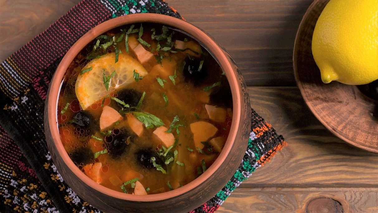 Подавать солянку с ломтиками лимона и мелко нарезанной зеленью.