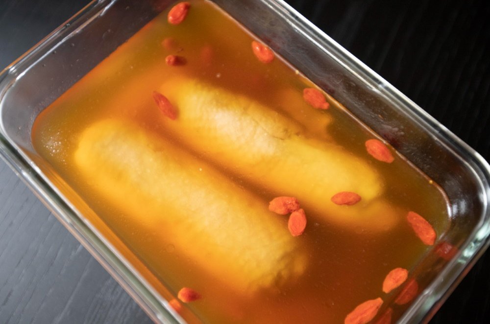 The chicken is soaked in wine until it’s removed from its bath and plated. The marinating liquid is 50% rice wine and 50% chicken broth, so you probably won’t enjoy this recipe if you’re not a fan of either. The juicy chicken flesh is simply dripping with what has been described by many as a chicken cocktail, and the meat is imbued with such an alcoholic flavor that if you eat a lot, you might end up getting a little buzzed.