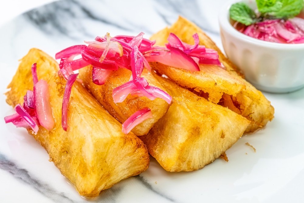 Boiled yuca (cassava) topped with a garlicky sauce made with lime juice, olive oil, and onions.